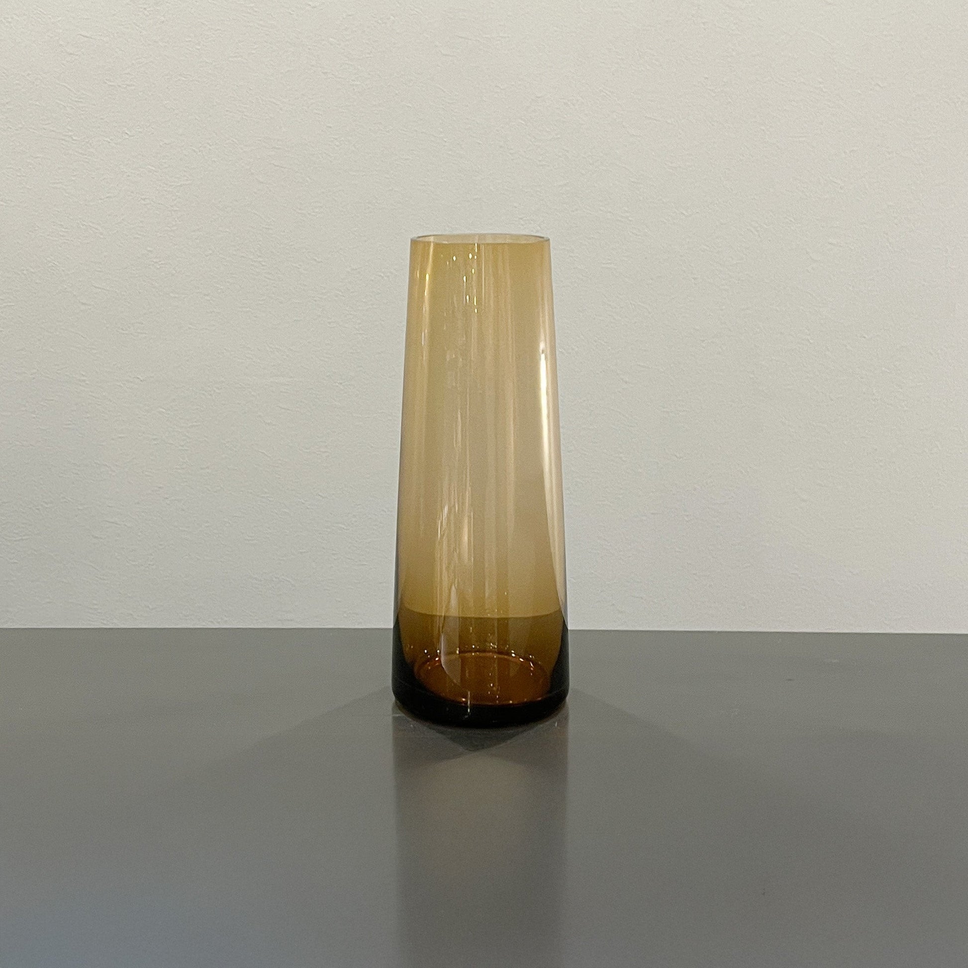 琥珀色のガラスが落ち着いた存在感を放つ、円すい型のガラス花瓶(高さ27cm)。すっきりとした直線的なフォルムが特徴で、空間に凛とした上質感を添えてくれます。