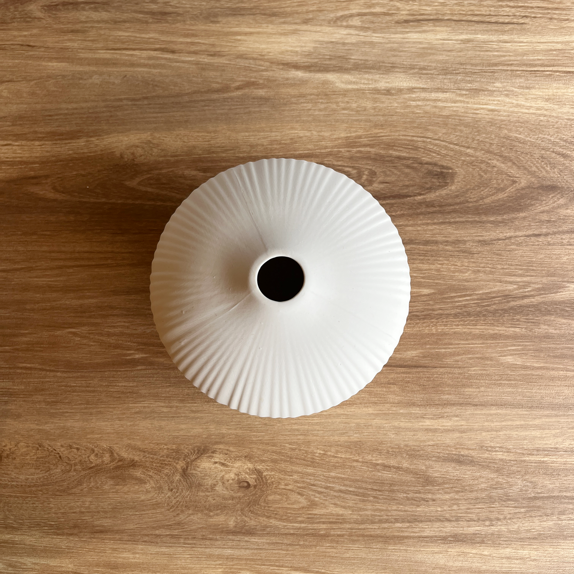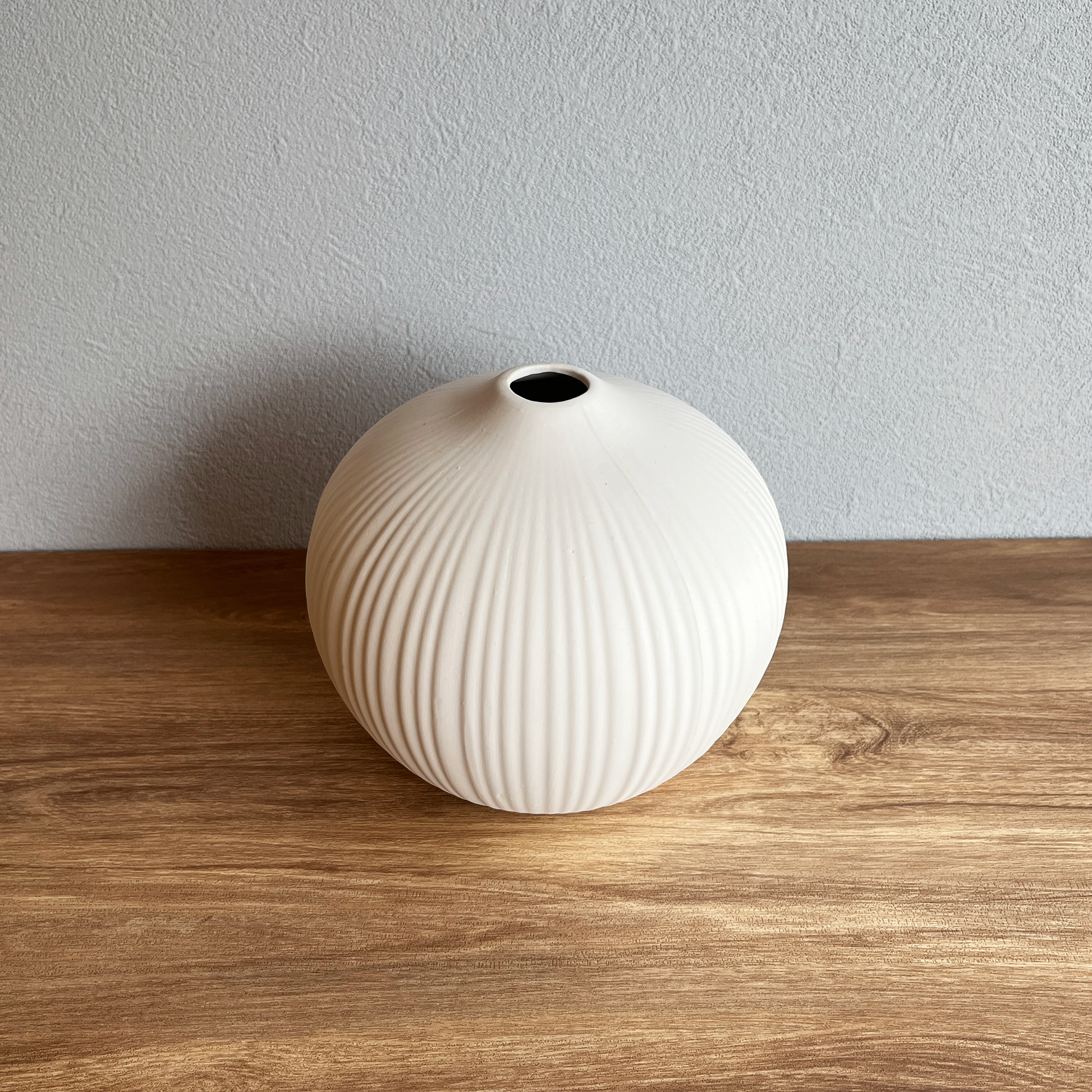 まるく膨らんだ球体フォルムと、繊細な縦のラインが印象的な陶器の花器。